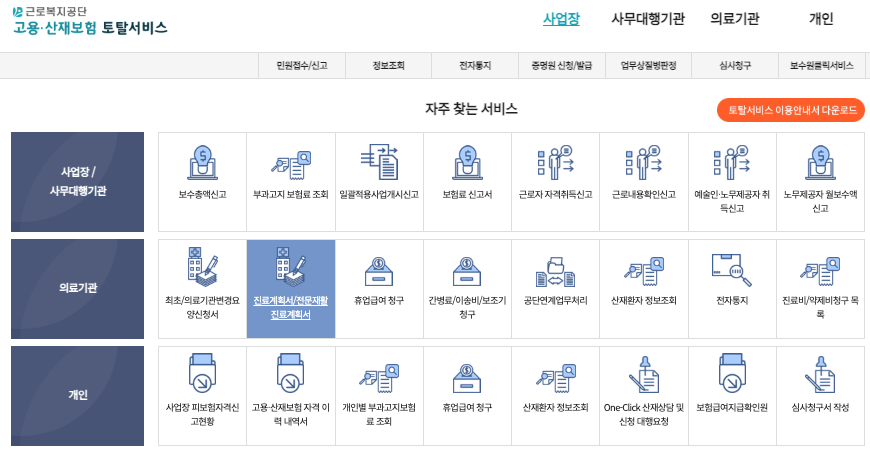 - 요양급여 · 휴업급여 · 장해보상급여 · 간병급여 등의 전자 신청