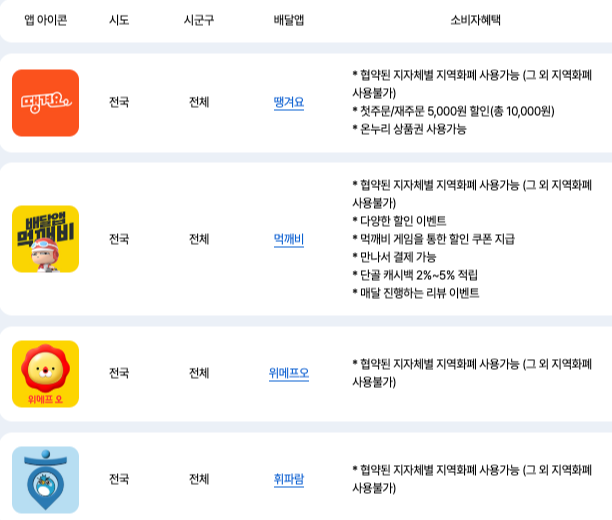 | 민관 협력형(4개) | 땡겨요, 먹깨비, 위메프오, 휘파람 |