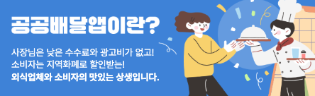 공공배달앱은 지방자치단체나 정부·민간이 함께 만들어 운영하는 배달 주문 서비스입니다. 민간 배달앱에 비해 수수료가 낮아, 외식업에 종사하는 소상공인들이 보다 적은 비용으로 배달 서비스를 이용할 수 있도록 돕는 것이 핵심입니다.