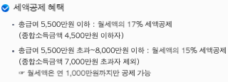 | 공제율 | 총급여 5,500만 원 이하: 17%, 5,500만 원 초과 ~ 7,000만 원 이하: 15% |
