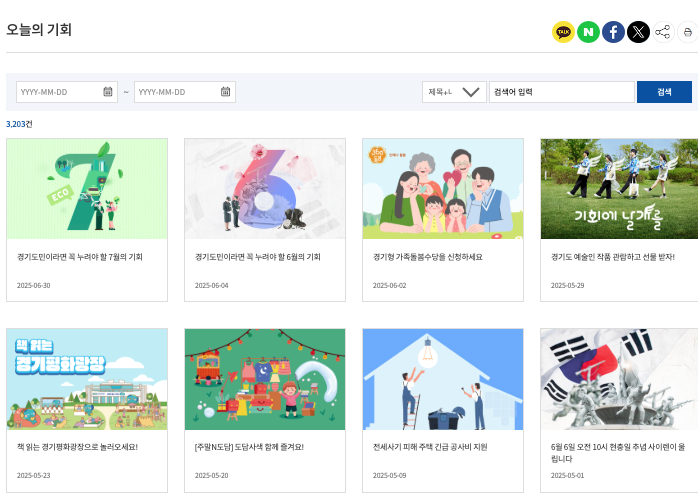경기소식 이나 오늘의 기회 메뉴에 들어가면 지역별, 분야별 행사나 모집 정보를 확인할 수 있습니다.