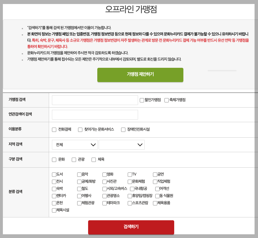 가맹점 전체 목록은 문화누리카드 공식 홈페이지에서 확인이 가능합니다.