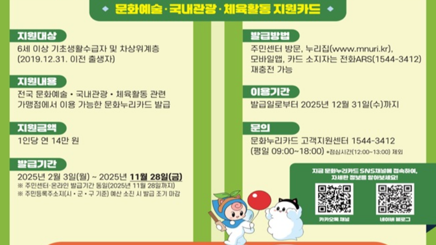 2025년 문화누리카드 지원금이 1인당 14만 원으로 인상되었습니다. 바둑과 낚시가 신규 사용처로 추가되어 다양한 문화 활동에 사용할 수 있습니다.