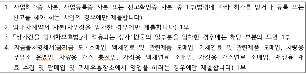 - 사업장으로 사용할 공간을 임대했을 경우에는 임대인과 체결한 임대차계약서 필요함