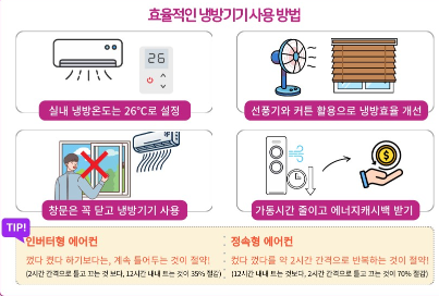 A. 여름철에는 에어컨 설정 온도를 1~2도 높이고, 주간 사용시간을 야간으로 조절하면 소비량을 쉽게 낮출 수 있습니다.