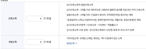 - 근로소득: 월급 및 일용직 수입 등 지속적인 소득을 입력합니다.