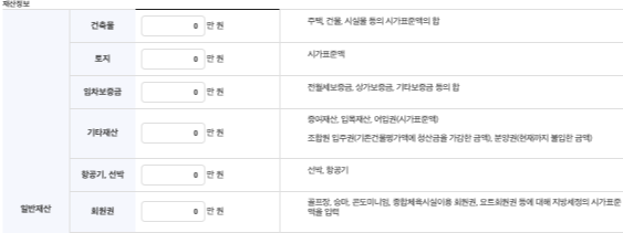 - 금융재산: 예금과 적금 및 주식, 보장료의 해지환급금 등을 입력합니다.