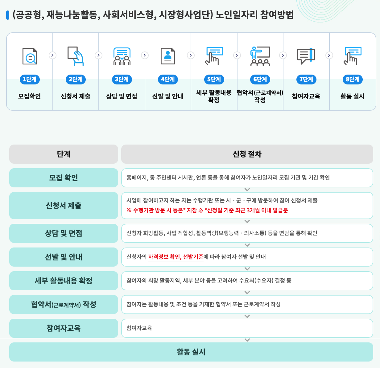 3. 연령 기준(만 60세 이상 또는 65세 이상)을 충족해야 하며 공공 일자리 사업에 중복 참여할 수 없습니다.