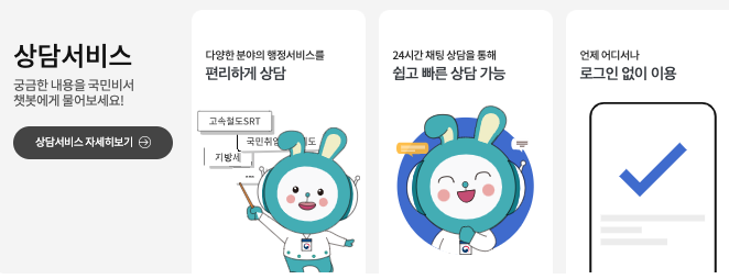 - 24시간 자동응답을 통해 기본적인 민원 안내를 받을 수 있으며 질문에 따라 맞춤형 안내 제공