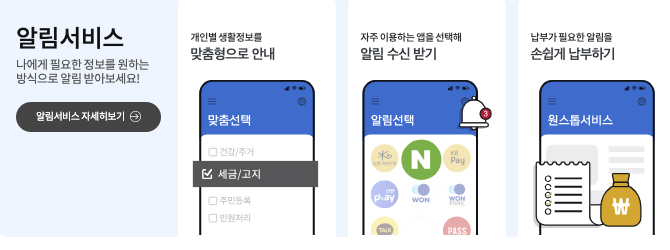 - 공공서비스에서 발생하는 고지와 납부 및 만기 등의 정보를 미리 받아볼 수 있고 '맞춤 알림 신청' 기능제공