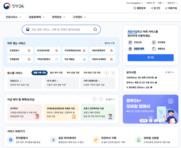 중앙부처와 지방자치단체, 공공기관의 시스템이 연결되어 있어 다양한 민원을 온라인으로 신청하고 출력할 수 있습니다. 사용자의 연령이나 상황에 맞는 맞춤형 혜택과 생애주기별 지원 정보도 확인할 수 있어 실용적입니다. 국민 누구나 쉽게 행정 서비스를 이용할 수 있도록 돕는 디지털 행정 포털입니다.