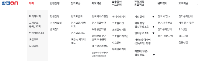 한전온 홈페이지 주요 메뉴 구성