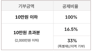 - 연간 기부금 중 10만 원까지는 전액 세액공제 가능