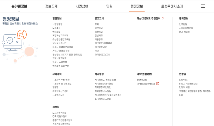 A. 분야별 정보와 민원 및 정보공개·시민참여·행정정보·화성특례시 소개 등