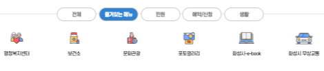 A. 메인화면의 즐겨 찾는 메뉴에서 행정복지센터와 보건소 및 문화관광, 무상교통 등