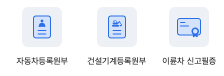 - 온라인민원신청: 작성 중인 민원 확인과 등록 민원 조회 및 발급·열람 민원, 불법운행자동차 신고