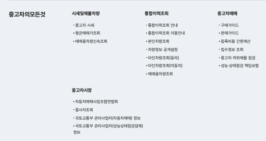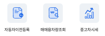- 시세 및 매물차량: 중고차 시세 확인과 평균 매매가 조회 및 매매용 차량 신속 조회