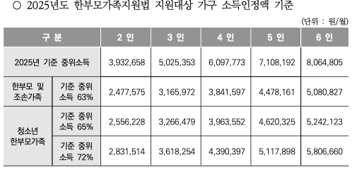 한부모가정 재산기준 및 소득인정액