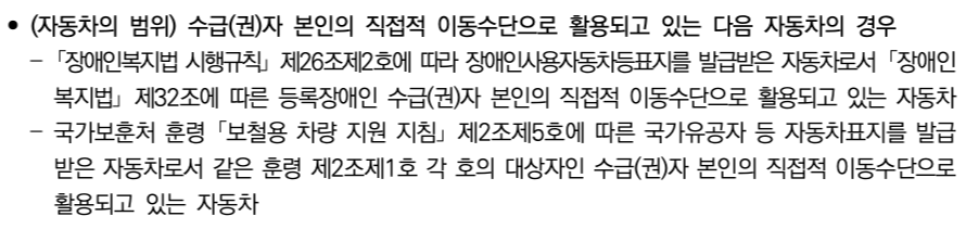 - 장애인 등록 차량과 국가유공자 차량 및 특수 목적 차량 등은