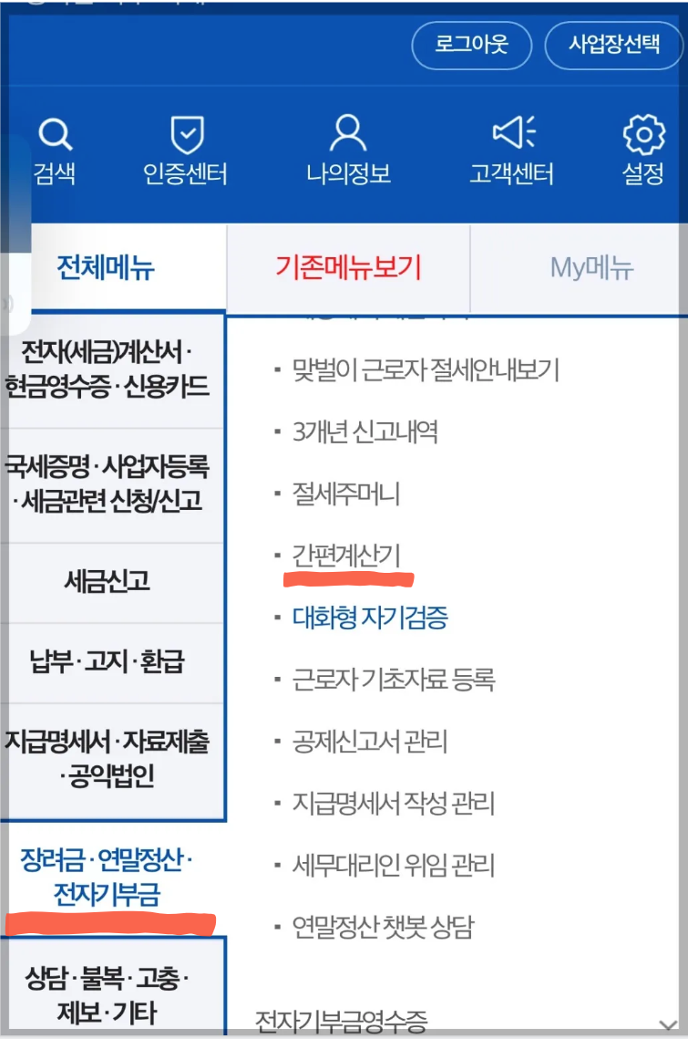▶ 로그인 후 우측 상단 "전체 메뉴→기존 메뉴 보기→ 장려금·연말정산·전자기부금→간편 계산기"