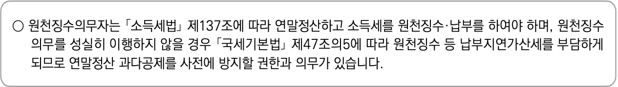 ✅ 의무 사항: 회사는 일용직을 제외한 모든 근로자(퇴사자 포함)의 연말정산을 2025년 2월 급여 지급까지 완료해야 하며 3월 10일까지 원천세 신고 및 지급명세서를 제출해야 합니다.
