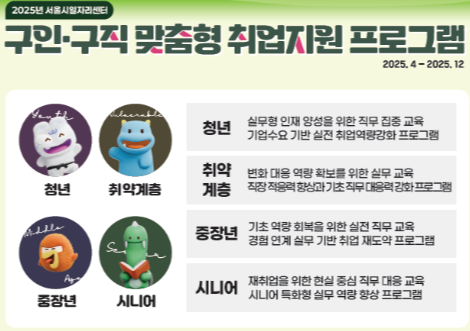 - 서울형 청년인턴과 여성재취업 지원 프로그램 및 중장년 커리어전환 과정 포함