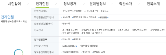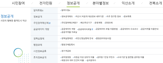 익산시청 홈페이지 주요 메뉴 구성은 시민참여와 전자민원 및 정보공개, 분야별 정보 등으로 구성되어 있습니다.