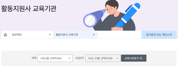 - 접근 경로: 홈페이지 접속 후 상단메뉴에서 '정보마당' 클릭하고 '활동지원사 교육기관' 선택