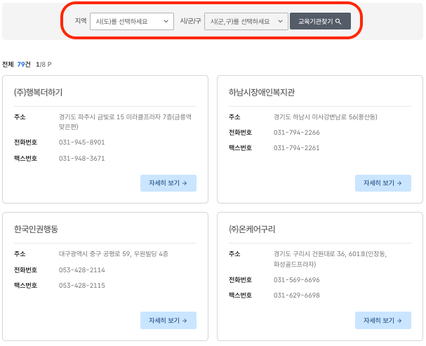 교육기관’ 메뉴에서 지역별로 확인할 수 있습니다.
