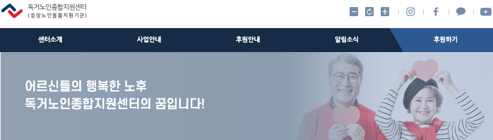 독거노인종합지원센터 홈페이지 메뉴별 구성은 센터소개와 돌봄·사랑잇기·연구 등 사업안내 및 후원안내, 알림 소식, 후원하기