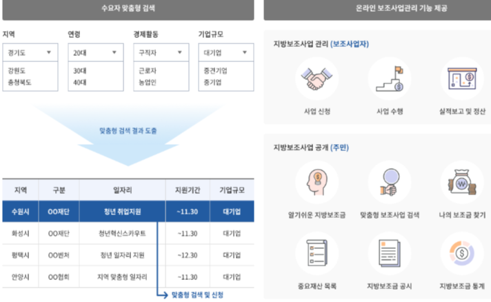 - 주민들이 참여할 수 있는 맞춤형 보조사업 검색 서비스 제공