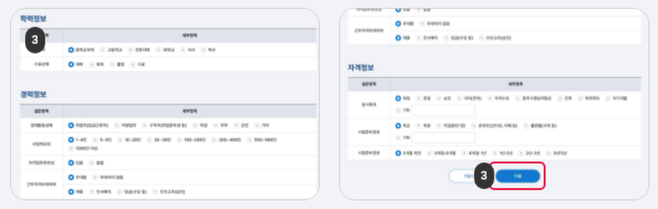 3. 학력 및 경력 및 자격정보에 대한 설문항목에 답변을 입력하고 다음 단계로 이동합니다