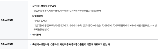 또한 국가유공자와 국가무형유산 보유자 및 북한이탈주민과 노숙인 등도 상황에 따라 지원을 받을 수 있습니다.