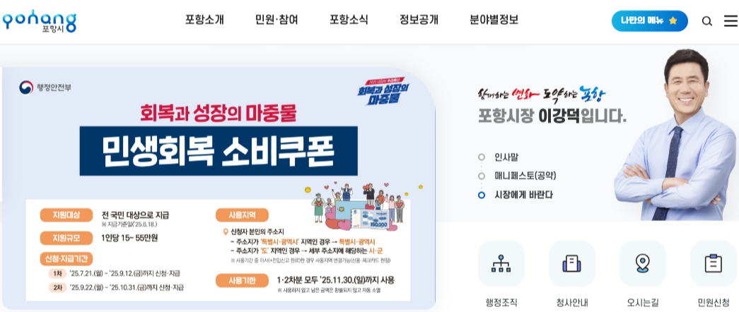 포항시청 홈페이지는 복지와 환경 및 주택, 교통, 농축해양수산, 푸른 도시, 지역경제 등 시민 생활 전반을