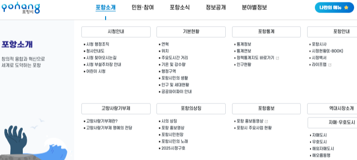 포항시청 홈페이지는 포항소개와 민원·참여 및 포항소식, 정보공개, 분야별 정보 등 시민 생활에 필요한