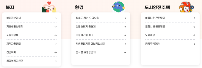 포항시청 홈페이지는 자주 찾는 서비스는 수도요금 조회부터 폐기물 배출, 교통·복지·일자리·교육·청년
