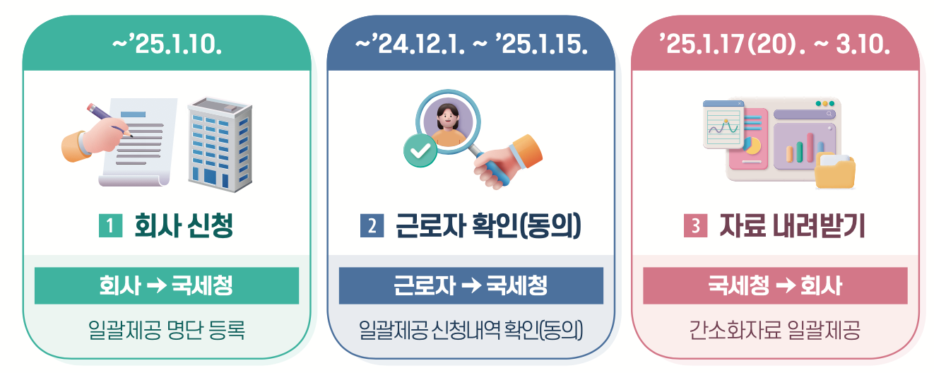 근로자의 명단을 1월 10일까지 등록 해야 하며 이를 통해 간소화 자료를 일괄로 홈택스에 신청합니다. 간소화 자료 활용은 1월 17일부터 3월 10일까지 자료를 토대로 연말정산 업무를 처리합니다.