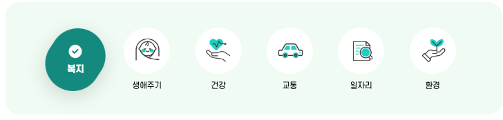 - 복지: 기초생활보장과 노인·장애인 복지 및 돌봄 서비스 등 생활 복지 안내