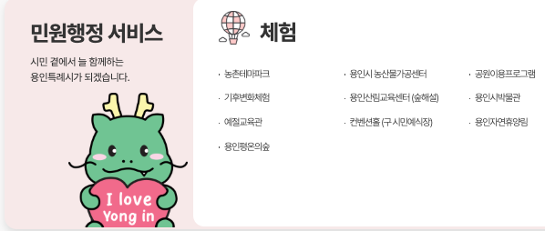 용인시청 홈페이지 민원행정 서비스는 민원 발급부터 행정·생활 정보 및 체험 프로그램까지