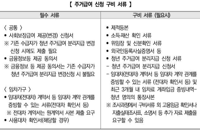- 청년 분리지급 대상: 부모와 주민등록이 다른 19세 이상~30세 미만 미혼 청년 중 동일 수급가구 소속자
