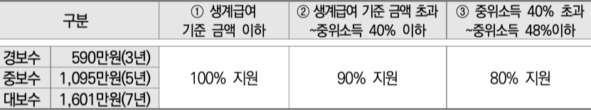 - 자가 가구: 주택 노후 정도에 따라 수선유지비(보수비) 지원