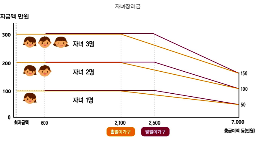| 최대지급액 | 자녀 1인당 100만원(최소 50만원) | ||