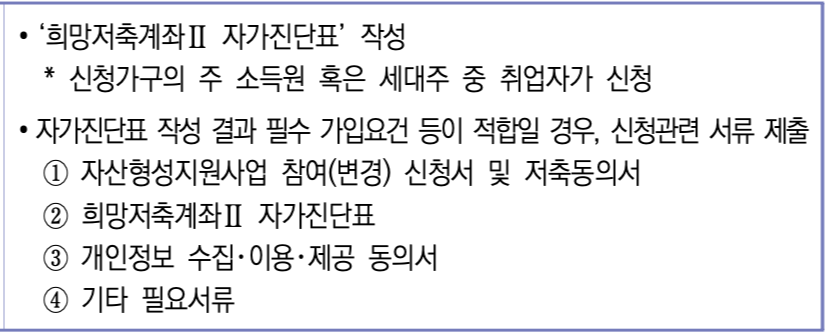 - '희망저축계좌2 자가진단표'를 작성해 본인이 가입 요건에 해당하는지 먼저 확인합니다.