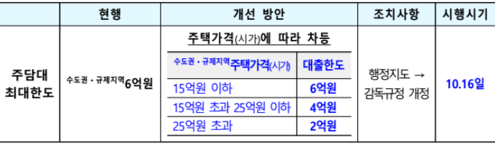 - 수도권과 규제지역 내 주택의 금액대별로 자금 이용 한도를 차등 적용함.