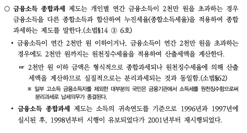 - 연간 금융소득(이자소득과 배당소득) 합계가 2,000만 원 초과 시 적용