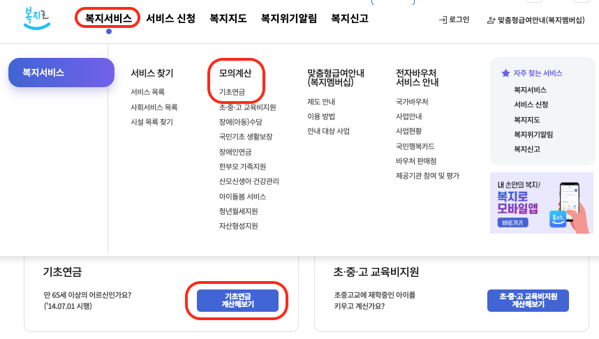 2. 상단 '복지서비스' 메뉴에서 '모의계산 → 기초연금'을 선택합니다.