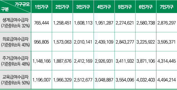 중위소득 50% 이하 가구는 소득과 재산, 가구 여건에 따라 생계·의료·주거·교육 등