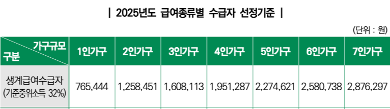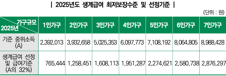 - 생계급여 기준은 매년 보건복지부가 고시하는 기준 중위소득에 따라 달라집니다.