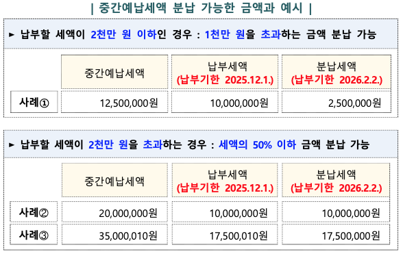 → 가능합니다. 중간예납세액이 1천만 원을 초과하는 경우, 일부 금액을 다음 해 2월 초까지