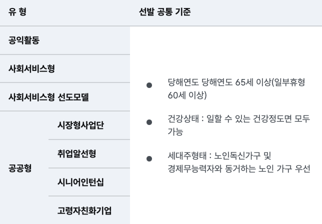 - 만 60세 이상: 시장형·사회서비스형 · 인력파견형 등 참여 가능